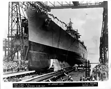 The US Navy awarded the contract for Helena to the New York Navy Yard on 9 September 1935, and the keel for the new ship was laid down on 9 December 1936. Her completed hull was launched on 28 August 1938 and she was commissioned on 18 September 1939 with the hull number CL-50.[2][16][17] World War II had broken out in Europe in September that year, but for the time being, the United States remained neutral. After entering service, the ship was occupied with sea trials and initial training, and she embarked on a major shakedown cruise abroad on 27 December, bound for South American waters. She stopped in Guantanamo Bay, an American-leased naval base in Cuba, on the way before arriving in Buenos Aires, Argentina, on 22 January 1940; from there, she continued on to Montevideo, Uruguay, on 29 January. While in the latter port, the crew inspected the wreck of the German heavy cruiser Admiral Graf Spee that had recently been scuttled after the Battle of the River Plate the previous month. Helena got underway again in mid-February to return to the United States, again passing through Guantanamo Bay on the way. After returning, she was dry-docked for repairs from 2 March to 14 July.[16][18]