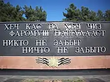 Victory Park was opened in honor of the 40th anniversary of the Victory in the Great Patriotic War, however, the architectural and sculptural memorial complex was built in 1975. The central area is filled with an eternal flame, an alley of Heroes with high relief and sculpture Mother. At the foot of the stair is a granite slab with inscriptions in Tajik soldiers that were awarded the title of Hero of the Soviet Union.[5]