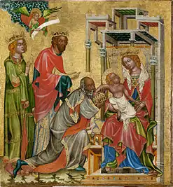 This scene repeats the analogous composition of the throne as it appears in the painting of the Annunciation and the customary model that was maintained during the 14th century, one in which kings or wise men represented three ages of man and the second king, of a virile age, sometimes takes the form of the ruling monarch. It was only from the 1360s (or, more likely, from the early 15th century, because the black king in the Emmaus monastery painting was evidently a piece of Baroque overpainting) that the kings were more frequently portrayed as representatives of the three continents known at that time. In this scene as well, Mary remains a queen seated on a throne. The motif of an old man kissing the hand of a small child, one that was rare outside France until then, is the expression of a spiritual bond with Christ and originates in the work Meditationes Vitae Christi that appeared in Bohemia during the reign of Charles IV, Holy Roman Emperor. The throne is depicted in an imperfect empirical perspective. The Virgin Mary, obscuring one of the supporting pillars of the canopy, is symbolically presented as a pillar of the Christian Church.