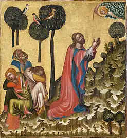 The main element of the composition is formed by the diagonal of the mount’s slope with jagged rock faces and blossoming spring vegetation. The picture represents a traditional iconographic arrangement with the praying Christ and three sleeping apostles: St Peter, St John and St James. Three accurately portrayed birds (a goldfinch, bullfinch and crested lark or hoopoe) evidently originate in English or French book painting. The goldfinch is often associated with the martyrdom of Christ, because it feeds on the seeds of thistles and metaphorically represents Christ’s crown of thorns. In medieval legend, the bullfinch is associated with the Crucifixion and its red breast with drops of Christ’s blood refers to the moment the bullfinch pulled out a nail from the cross with its beak.[8] The crested lark could, in earlier literature, be associated with the martyrdom of Christ.[9]