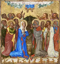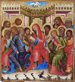 At the centre of the Pentecost scene, which in Byzantine painting usually featured St Peter and St Paul, the Virgin Mary sits with an open book. The twelve apostles, upon whom the Holy Spirit descended in the form of tongues as of fire, were endowed with the gift of mastering the languages of all nations so they could spread the gospel. The motif of the apostle who is placing his finger to his mouth as a symbol of silence was adopted from Italian art, in which it represents an allegory of obedience or patience.[12]