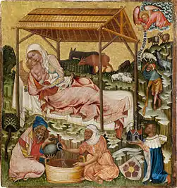 This picture connects three scenes. The central scene is that of Mary with the infant Christ in a simple, open shelter. She is accompanied in the background by the customary apocryphal animals. In the foreground, Joseph is preparing a bath with the midwife (called Salome in the Apocrypha) and in the background the archangel Gabriel is announcing the good tidings to the shepherds (the Annunciation to the Shepherds scene). The active involvement of Joseph as a foster father in the events of the scene, specifically in the active care for the new-born baby, is relatively unusual in the first half of the 14th century although it does appear as early as the 13th century. However it appears more often from the turn of the 14th century (for example with Joseph cooking porridge, preparing a bath, sewing and drying nappies, preparing food for Mary and feeding the donkey and ox). It is not based in any literary sources and, in all likelihood, originated in the secular context of burgher society; we can also trace how it was received and reflected on in period ‘carols’ that, however, represent the foster father of Our Lord as a rather grotesque figure. At the same time, from the 14th and 15th centuries onwards, official respect for St Joseph grew. In all the scenes there is a multitude of small motifs that have their origin in Byzantine art mediated, or rather interpreted, by Italian masters.