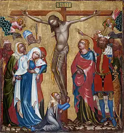 The type of Crucifixion with a single cross and a group of figures is customary for the 13th century. Several motifs, such as the fainting Mary, Mary Magdalene embracing the cross and flying angels with incense burners, originate in the Italian context.