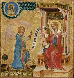The Angel of the Annunciation comes to the Virgin Mary, who holds an open book in her hand. The band of the inscription reads Ave gracia plena d(omi)n(u)s tecu(m). The scene is accompanied by the customary symbols – a lily and Mary holding a veil (virginity), an open book (conception) and peacocks (immortality and eternity). A series of other symbols provides various interpretations (God sending dew from heaven or manna in the desert; a coffer of money). Mary on her throne thus represents the Virgin of the Temple of God protecting the Ark of the Covenant or else the Queen of Heaven,[5] the throne also being her bed chamber. Her crown’s garland of nine stars could be an astrologically-related depiction of the constellation of Virgo.[6] A less evident symbol is the motif of a tree with a small double trunk in the left-hand part which refers to the trees of life and knowledge in paradise as well as to the double incarnation of Christ as God and man.