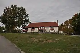 The estate complex at the summit of Prospect Mountain includes the main house, a carriage house, a stone tower, and servants' quarters. The main house is a two-story frame structure, finished in stucco in an eclectic combination of the Tudor and Spanish Mediterranean Revivals. It is covered by a clipped gable roof of red tile, and has half-timbering in the English country style. This styling is continued in the carriage house and servants' quarters, although their roofs are asphalt shingle. The circular stone tower, originally fitted with a central water storage tank, is open to the public, and provides expansive 360° views of the countryside. The main house has a museum with displays on the history of the Weeks family and the involvement of Weeks in the early 20th-century conservation movement.[5]