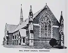 To service the Wesleyan Methodist congregation in Toowoomba a stone church in Neil Street was constructed in 1864–65, prior to which services were held in a large building owned by the Presbyterian Church. A foundation stone for the first Wesleyan Methodist church, designed by James Cowlishaw, was laid by Mrs Groom on 19 October 1864. The church, a rectangular planned masonry building, was opened on 2 April 1865. This building was rendered inadequate for the growing congregation and temporary use was made of the School of Arts hall, but more permanent accommodation was sought.[1]