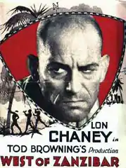 West of Zanzibar is a 1928 American silent film directed by Tod Browning. The screenplay concerns a vengeful stage magician named Phroso (Lon Chaney) who becomes paralyzed in a brawl with a rival (Lionel Barrymore). The supporting cast includes Mary Nolan and Warner Baxter. The screenplay was written by Elliott Clawson, based on a play named Kongo by Charles de Vonde and Kilbourn Gordon.[1] Walter Huston starred in the stage play and later played Phroso again in the 1932 sound film remake of the same story which was also called Kongo.