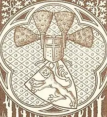 ![]() a silver lion in blue, blue-silver helmet covers four, two posts and two bars, golden arrows. | |