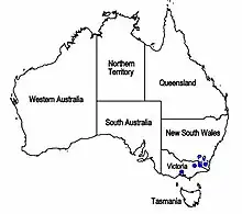 The species is found in the Australian Alps IBRA bioregion in south-eastern New South Wales and north-eastern Victoria, from Kosciuszko National Park to the vicinity of Mount Bogong, in rocky areas with snow gum woodland or alpine heath.[2][3]