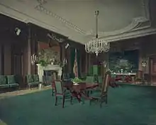The project had to suit the needs of the modern Presidency while retaining the symbolism of the nation's pre-eminent historic home, adhering to a historical style or period, and working on a very tight budget. Prior to the reconstruction, the greatest historical link was through the house itself; the furnishings and most artwork were from recent decades. The reconstruction retained the historic exterior but removed most of the interior's link to the past. One columnist observed, "When those floors creaked, you knew Lincoln had been walking there before you."[40] The reconstructed interiors were described as "stark", reminding Eleanor Roosevelt of a hotel.[41]