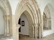Nothing remains of the original castle of Wilhering nor of any buildings erected by the monks of Rein. The monks of Ebrach, however, started the construction of a church in 1195 in the Romanesque style, repeatedly rebuilt in the following centuries. Of the previous buildings, only a Romanesque doorway, parts of the Gothic cloister and two tombs Gothic Schaunberg family tombs located on either side of the entrance by the western wall of the abbey church remain. The plain round-arched Romanesque portal of the former 12th-century church was integrated into the present Rococo church.