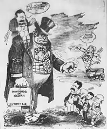 Kinney grew disenchanted with the territorial government. Instead of the labor reform he had hoped for, he considered the sugarcane plantation owners, known as the "Big Five", an oligopoly which continued to exploit cheap workers. By 1912 he joined with congressional delegate Jonah Kūhiō Kalanianaʻole in public opposition to appointed Territorial Governor Walter F. Frear.[23] Kūhiō was the only territorial-wide elected official, although with no direct power. Earlier a firmly conservative Republican,[5] Kinney switched to the Democratic Party of Hawaii. When Democratic President Woodrow Wilson was elected in 1912, Kinney lobbied for a strong reformer to be swiftly appointed as governor. Kinney was attacked in the Hawaii press (controlled by Republicans), and characterized as proposing a carpetbagger for governor. Frear said "Mr. Kinney would do better if he stayed here and worked for the best interests of the Territory, instead of going to Washington and complaining."[24] Although the local party supported Lincoln Loy McCandless, it was not until November 1913 that Wilson appointed Lucius E. Pinkham. Pinkham had not lived in Hawaii and but had represented plantation owners and other industrialists earlier.[25]