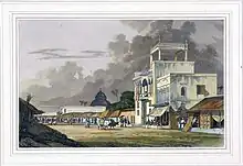 Daniell was sixteen when he accompanied his uncle to India. On 17 July 1786, a few months after their arrival in Calcutta, Thomas Daniell placed an advertisement in the Calcutta Chronicle, announcing the forthcoming publication of a set of twelve views of the city.[3] This seemed a promising idea, since Calcutta was rapidly expanding and its European inhabitants might be willing to buy prints showing its latest buildings. Both he and William were inexperienced printmakers and had to enlist the help of Indian craftsmen, but the set, executed in aquatint,[3] was completed in November 1788 and sold well. Thomas then began planning an ambitious tour of northern India, possibly inspired by the wealth of picturesque scenery indicated in William Hodges's collection of aquatints, Select Views in India (1785–8). In August 1789, Thomas and William set off up-river past Murshidabad to Bhagalpur, where they stayed with Samuel Davis (1760–1819), an employee of the East India Company and a skilled amateur artist. They continued on to Kanpur and then travelled overland to Delhi, visiting Agra, Fatehpur Sikri and Mathura on the way; the following April they made a pioneering tour to Srinagar, Uttarakhand and Garhwal in the Himalayas.