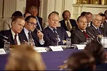 In February 1978, after President Carter nominated G. William Miller for Chair of the Federal Reserve, Proxmire was noted to be a reliable source of contention but predicted from the start of his confirmation process that Miller would meet little opposition.[49] At the end of the month, eleven members of the Senate Banking Committee pressed for a confirmation of Miller as Federal Reserve Chair, a motion that Proxmire rejected while he was scheduling the vote for another day, and he admitted that the nomination would be easily confirmed by the panel and the full chamber.[50] On March 2, Proxmire cast the sole dissenting vote against the Miller nomination and called him unqualified for the office since he was without experience in economic or monetary affairs. Proxmire acknowledged Miller's business success and was joined by ranking Republican, Edward W. Brooke, in indicating that the Carter administration had influenced members of the panel to hasten the confirmation process.[51]
