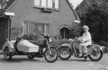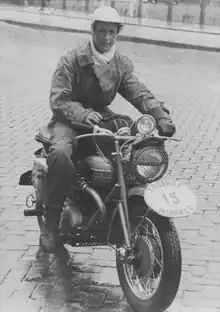 After her active sports career, she got married and had two children. After twenty-five years she picked up motorcycling again and continued to do so until her death. First she drove a Velocette LE and then the BMW R45 with MZ sidecar came along, with her dog Dempsey always accompanying her. In 1999, to celebrate her 75th birthday and that she had started motorsport 50 years earlier, a race of honor with classic motorcycles [7] was organized. She was an honorary member of several motorcycle clubs in Europe.[8][9] Her last ride was on her MZ sidecar, during an impressive parade of antique motorcycles that paid tribute to her on October 26, 2002, after she passed away October 22 at the age of 78.