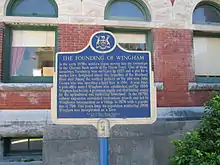 The original survey for Wingham was conducted in 1854, with 1,000 acres dedicated to the community north of what is now Highway 86 and Highway 4. The initial townsite was oriented around the Maitland River, with the assumption that its water power and transportation opportunities would make it the focal point for development.[2] Indeed, when a basic settlement formed, it was around an early saw and shingle mill. The form of the settlement soon changed, however, when the proposed Canada North-West Railway line was surveyed to the south of the village in 1858. In anticipation of the arrival of the railway, Wingham developed into two distinct areas: an older, "stagnant" Lower Wingham which comprised the initial settlement, as well as a more dynamic Upper Wingham located near the proposed railway line. It would be over a decade until the railway finally did arrive, but in the meantime, the town had developed a number of typical pioneer industries, including a woollen mill, a tannery, and a foundry. An upper dam site was established, where a new flour mill and sawmill were constructed.[3] During the 1860s, the main commercial thoroughfare was Victoria Street.[3] However, the commercial centre of the settlement gradually shifted to Josephine Street by the 1870s, especially after the arrival of the Wellington, Grey and Bruce Railway in 1872.