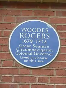 Woodes Rogers was the eldest son and heir of Woods Rogers, a successful merchant captain. Woodes Rogers spent part of his childhood in Poole, England, where he likely attended the local school; his father, who owned shares in many ships, was often away nine months of the year with the Newfoundland fishing fleet. Sometime between 1690 and 1696, Captain Rogers moved his family to Bristol.[2] In November 1697, Woodes Rogers was apprenticed to Bristol mariner John Yeamans, to learn the profession of a sailor. At 18, Rogers was somewhat old to be starting a seven-year apprenticeship. His biographer, Brian Little, suggests that this might have been a way for the newcomers to become part of Bristol maritime society, as well as making it possible for Woodes Rogers to become a freeman, or voting citizen, of the city. Little also suggests that it is likely that Rogers gained his maritime experience with Yeamans' ship on the Newfoundland fleet.[3]