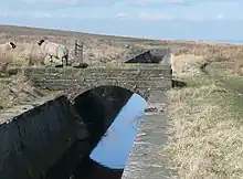 A smaller reservoir was built at Sugden End above Cross Roads, but this is now disused, with a view to turning it into a community asset.[32] Conduits were built by the Bradford Corporation to supply water to their reservoirs at Thornton Moor and Stubden. The mill owners in the Worth Valley still needed water, so the compensation reservoirs at Leeming and Leeshaw were built. Prior to the diverting of the water into conduits and reservoirs, the River Worth and its associated streams were subjected to a far heavier flow than after the damming of the waters.[33] Many other reservoirs, conduits and aqueducts were planned and listed, but some did not come to fruition - for example, the Sladen valley was to have two reservoirs but only Lower Laithe was built. The upper reservoir near to a point known as Bully Trees, was abandoned due to the geological instability of the area.[34][25]
