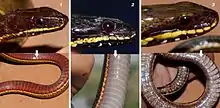 This snake is brown above, with or without darker spots and with a more or less distinct paler dorsolateral band. The lower parts are cherry-red to purplish-black, with a yellow band on each side extending from the lips to the end of the tail. Total length is two feet, and the tail is 5.5 inches.[2]