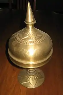 The Xorai (Assamese pronunciation: [xɔɹaɪ]), a manufactured bell metal product is one of the traditional symbols of Assam, which is considered as an article of great respect by the people of Assam.[1][2][3] In simplistic terms it is an offering tray with a stand at the bottom which is used in felicitations also.[4][5] There are Xorais with or without a cover on the top. Hajo and Sarthebari are the most important centers of traditional bell-metal and brass crafts in Assam.[6]