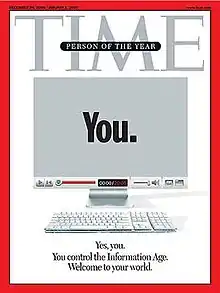 You was the official choice for Time's Person of the Year in 2006. The magazine set out to recognize the millions of people who anonymously contribute user-generated content to websites such as YouTube, MySpace, Facebook, Wikipedia and other wikis, and the multitudes of other websites featuring user contribution.[1][2]