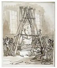 It was later acquired from Salt in 1821 by the British Museum and was at first displayed in the old Townley Galleries (now demolished) for several years, then installed (using heavy ropes and lifting equipment and with help from the Royal Engineers) in 1834 in the new Egyptian Sculpture Gallery (now Room 4, where it now resides). The soldiers were commanded by a Waterloo veteran, Major Charles Cornwallis Dansey, lame from a wound sustained there, who therefore sat whilst commanding them. On its arrival there, it could be said to be the first piece of Egyptian sculpture to be recognized as a work of art rather than a curiosity low down in the chain of art (with ancient Greek art at the pinnacle of this chain). It is museum number EA 19.[1]