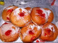 - sufganiyah; a deep-fried jelly doughnut, traditionally served on Hanukkah