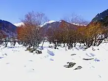 برف (barf, "snow") laying beneath trees in a valley in Gilgit-Baltistan