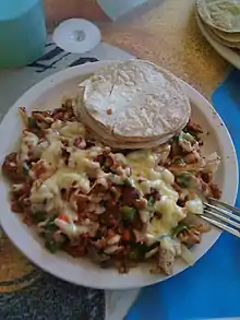 - A Mexican dish, consisting of meat (usually grilled beef) topped with cheese, salsa, and chopped bacon, onion, and pepper.