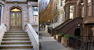 - (countable) A row house built of brownstone, especially in New York City. A Manhattan brownstone