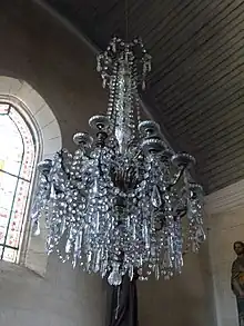 - (dated) A chandelier, particularly one decorated with glass lustres.