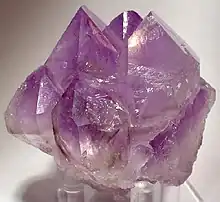 - A glass ornament such as a prism or cut glass dangling beneath a chandelier; usually in clusters or festoons.