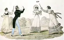 An 1817 fashion plate depicting three women and a man playing an inverse ring toss, in which they are tossing a quoit