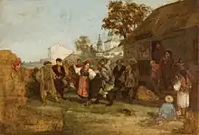 Borrowed from Russian (танцевать) русского ((tancevatʹ) russkovo).