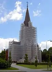 A scaffold (sense 1) installed around the dome of the United States Capitol in July 2016 for restoration work
