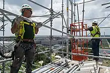 - A structure made of scaffolding for workers to stand on while working on a building.