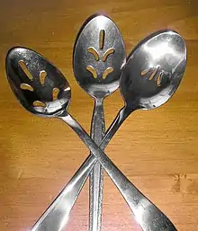 - spoon, slotted spoon (a large spoon for serving food; can be solid or slotted)