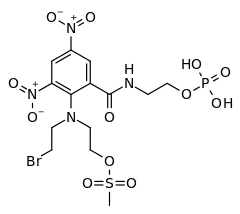 PR-104 is a drug from the class of hypoxia-activated prodrugs (HAPs),[1] which is being researched as a potential anti-cancer therapeutic agent. It is a phosphate ester “pre-prodrug” that is rapidly converted to the HAP PR-104A in the body. PR-104A is in turn metabolised to reactive nitrogen mustard DNA crosslinking agents in hypoxic tissues such as found in solid tumours.[2][3][4] Following initial clinical studies,[5][6] it was discovered that PR-104A is also activated by the enzyme AKR1C3, independently of hypoxia.[7] Hypoxia in the bone marrow of patients with leukaemia,[8][9] and high activity of AKR1C3 in some leukaemia subtypes [10][11] has led to interest in clinical trials of PR-104 in relapsed refractory acute leukaemias.[12][13]