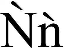 Ǹ, ǹ (n-grave) is a letter in the Yoruba language to place emphasis on the consonant; however, this rarely occurs. It is also part of the digraph ǹg in Hokkien Pe̍h-ōe-jī, which is used as a syllabic voiced velar nasal in the third tone (Chinese: 陰去; Pe̍h-ōe-jī: im-khì; lit. 'dark departing').