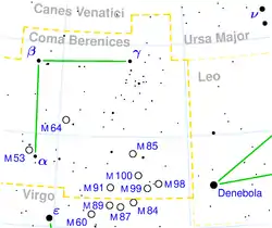 Beta Comae Berenices (β Comae Berenices, β Com) is a main sequence dwarf star in the northern constellation of Coma Berenices. It is located at a distance of about 29.95 light-years (9.18 parsecs) from Earth. The Greek letter beta (β) usually indicates that the star has the second highest visual magnitude in the constellation. However, with an apparent visual magnitude of 4.3,[2] this star is actually slightly brighter than α Comae Berenices. It can be seen with the naked eye, but may be too dim to be viewed from a built-up urban area.