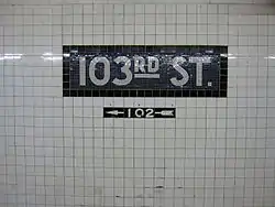 The 103rd Street station is a local station on the IND Eighth Avenue Line of the New York City Subway. Located at West 103rd Street and Central Park West on the Upper West Side, it is served by the B on weekdays, the C train at all times except nights, and the A train during late nights only.