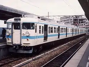 The 113 series (113系, 113-kei) is a Japanese suburban electric multiple unit (EMU) train type introduced in 1963 by Japanese National Railways (JNR), currently operated by West Japan Railway Company (JR-West) and Shikoku Railway Company (JR Shikoku), and formerly also operated by East Japan Railway Company (JR East) and Central Japan Railway Company (JR Central).