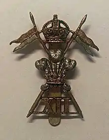 The 12th (Prince of Wales's) Royal Lancers was a cavalry regiment of the British Army first formed in 1715. It saw service for three centuries, including the First World War and the Second World War. The regiment survived the immediate post-war reduction in forces, but was slated for reduction in the 1957 Defence White Paper, and was amalgamated with the 9th Queen's Royal Lancers to form the 9th/12th Royal Lancers (Prince of Wales's) in 1960.