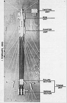 Originally, the weight-reduction phase had included removing the anchors from the battleship, but Wallin ordered one to be reattached to help shift Missouri's center of gravity forward to a narrower part of the battleship, thereby reducing the friction at her widest point.[18] During this time, the Bureau of Ships offered valuable technical and salvage advice to both the civilian and military participants in the salvage effort.[26]