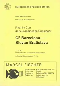The 1969 European Cup Winners' Cup Final was the final football match of the 1968–69 European Cup Winners' Cup and the ninth European Cup Winners' Cup final. It was contested between Slovan Bratislava of Czechoslovakia and Barcelona of Spain, and was held at St. Jakob Stadium in Basel, Switzerland. Slovan won the match 3–2 thanks to a goal by Ľudovít Cvetler, Vladimír Hrivnák and Ján Čapkovič.