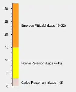 Emerson Fittipaldi took pole position for his home race from Carlos Reutemann. The start of the race was delayed as the track had to be swept clear of broken glass from over-exuberant spectators' celebrations and then Arturo Merzario's engine failed. When it did start, the flag caught some of the field unawares. Reutemann and Ronnie Peterson took advantage of the confusion to sweep into the lead, but by lap 4, Reutemann's tyres were going off. The race developed into a classic duel between Fittipaldi and Peterson, the Brazilian taking the lead on lap 16 and the Swede soon having to pit with a puncture (believed to be caused by some glass still left on the track).