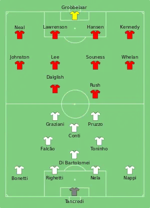 The opening passages of the match were tentative. Faced with a hostile atmosphere, Liverpool were content to sit back and frustrate Roma.[15] Despite this tactic, Liverpool took the lead in the 15th minute. Souness and Sammy Lee exchanged passes before passing to Craig Johnston on the right-hand side of the pitch. Johnston played a high cross into the Roma penalty area, which was challenged for by Roma goalkeeper Franco Tancredi and Ronnie Whelan. The result was that Tancredi dropped the ball, Roma defenders tried to clear the ball, but Michele Nappi's attempted clearance bounced off Tancredi's back and fell to Liverpool defender Phil Neal who scored to give Liverpool a 1–0 lead.[16] Two minutes later, Souness volleyed the ball into the Roma goal from close range, but his goal was disallowed for offside.[17]