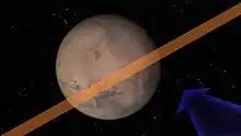 2007 WD5 is an Apollo asteroid some 50 m (160 ft) in diameter[2] and a Mars-crosser asteroid first observed on 20 November 2007, by Andrea Boattini of the Catalina Sky Survey. Early observations of 2007 WD5 caused excitement amongst the scientific community when it was estimated as having as high as a 1 in 25 chance of colliding with Mars on 30 January 2008.[6] However, by 9 January 2008, additional observations allowed NASA's Near Earth Object Program (NEOP) to reduce the uncertainty region resulting in only a 1-in-10,000 chance of impact.[7] 2007 WD5 most likely passed Mars at a distance of 6.5 Mars radii. Due to this relatively small distance and the uncertainty level of the prior observations, the gravitational effects of Mars on its trajectory are unknown and, according to Steven Chesley of NASA's Jet Propulsion Laboratory Near-Earth Object program, 2007 WD5 is currently considered 'lost' (see lost asteroids).[8]