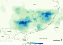 In Fujian, 400 victims of flooding were safely transferred and properly rehoused. Seventy-six people were killed, and 79 were missing from landslides in the province by June 21.[43][44] The village of Baozhuang was completely cut off for six days before rescue workers brought the residents to safety.[45] More than ten consecutive days of rain hit Nanping, and factories were destroyed. The number of people affected totaled 1.3 million, damages totaled 5.5 billion yuan, and 365,000 people were relocated.[29] Flooding destroyed a bridge in the province on July 7, travel was disrupted in 20 counties, and the town of Taining was completely underwater at one point.[46]
