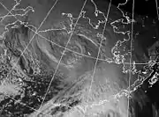 The second week of November saw one of the Alaska west coast's strongest cyclones since 1974 affect the area. On November 8, the 960-millibar (hPa; 28.35 inHg) low from which the storm would later materialize traveled from its 3:00 a.m. AKST (12:00 UTC) position over the southern Aleutian Islands to near the Gulf of Anadyr by 9:00 p.m. (06:00 UTC November 9), by which time its pressure had decreased to 945 millibars (hPa; 27.91 inHg). The system then went on the cross the Chukotsk Peninsula at 9:00 a.m. (18:00 UTC) on November 9 with a pressure of 956 millibars (hPa; 28.23 inHg), weakening to a 958-millibar (hPa; 28.29-inHg) low over the Chukchi Sea by 9:00 p.m. (06:00 UTC November 10). It then translated in a northwestward direction, ultimately weakening to 975 millibars (hPa; 28.80 inHg) by 3:00 p.m. on November 10 (00:00 UTC November 11), roughly 150 miles (240 km) north of Wrangel Island.[8] During the storm, numerous areas saw winds, sometimes of hurricane-force,[7] combine with snow to create blizzard conditions. This occurred in the village of Wales, which saw winds gust as high as 77 knots (89 mph). The National Weather Service office in Nome recorded 6.4 inches (160 mm) of snows during the storm. Apart from the mainland, additional impacts were observed on the islands of St. Lawrence and Little Diomede, the latter of which observed waves estimated to be 30 feet (9.1 m) in height and was the subject of an unofficial report of a peak wind gust as high as 81 knots (93 mph).[8] One National Weather Service official compared the storm to a Category 3 hurricane.[9]